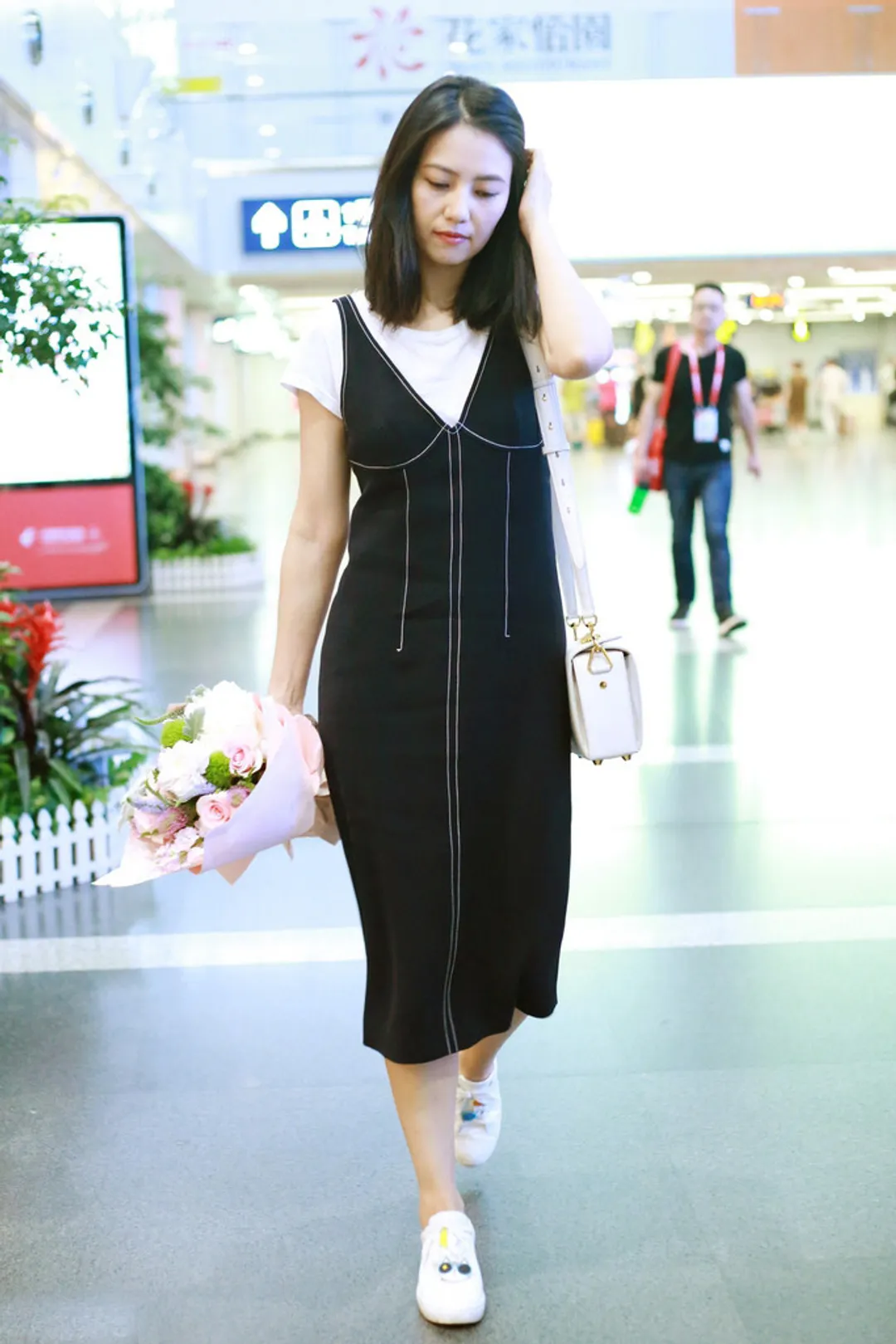 谭松韵碎花裙机场照图片