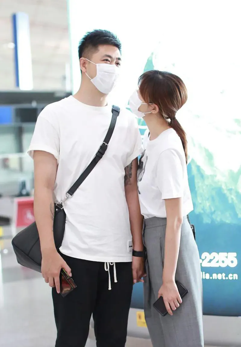 李艾老公甜蜜情侣装手牵手机场照图片