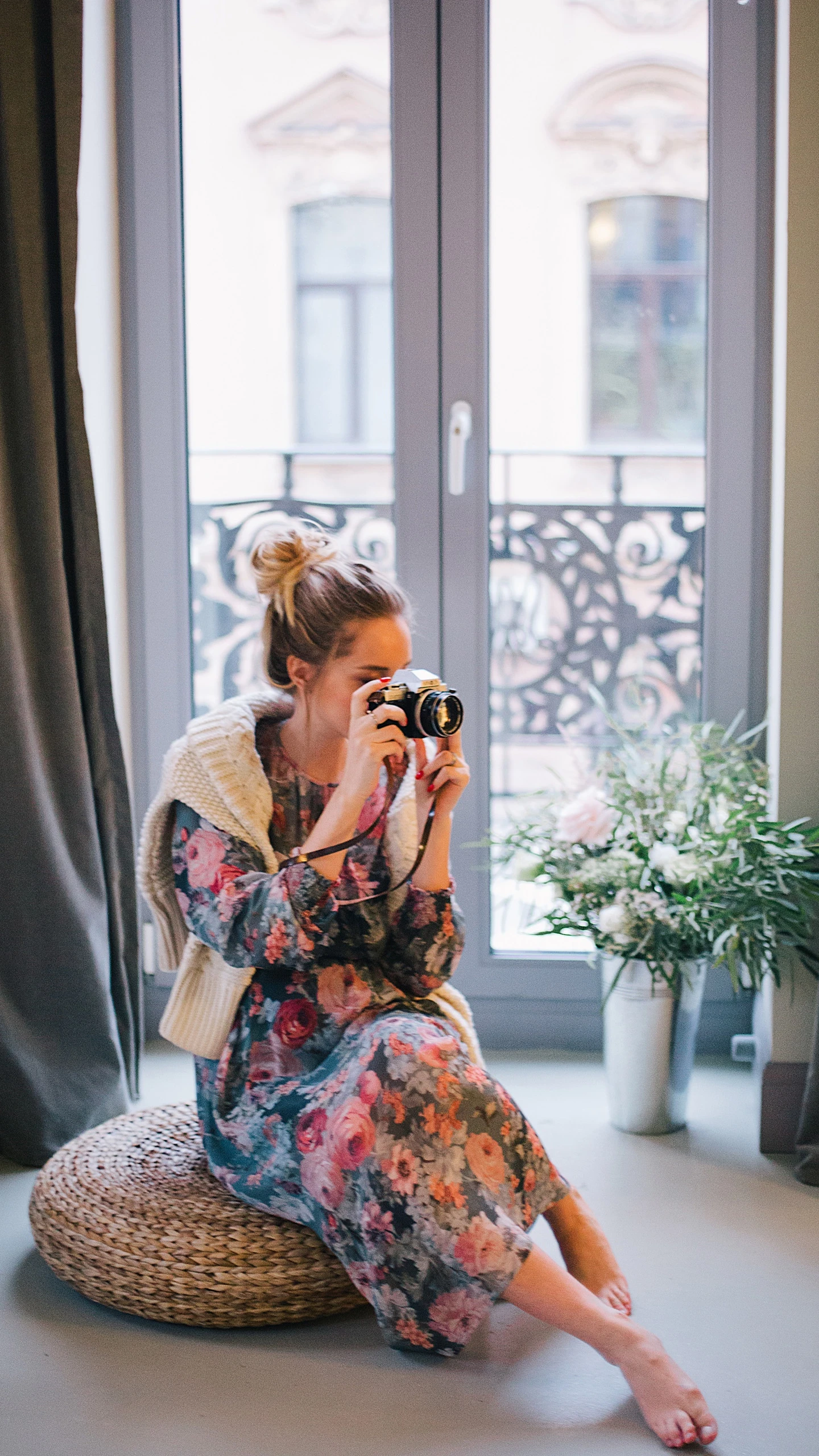 一个时尚的女郎在卧室里拍摄