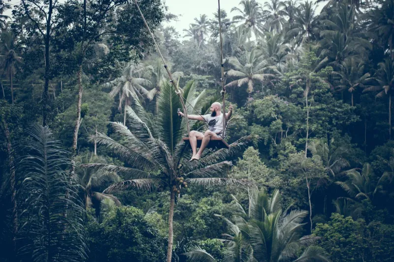 绿色丛林中荡秋千的人物图片