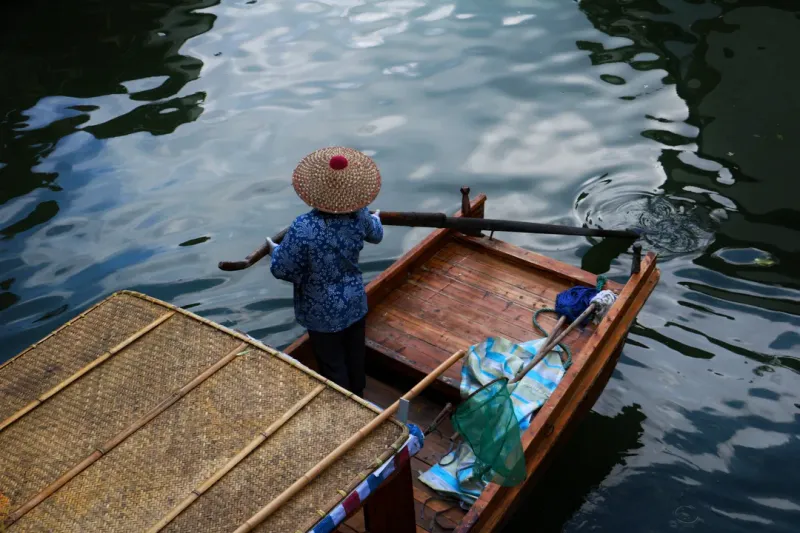 红衣美女在船上