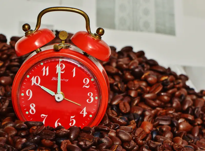 红色闹钟和咖啡豆放在一起图片第张