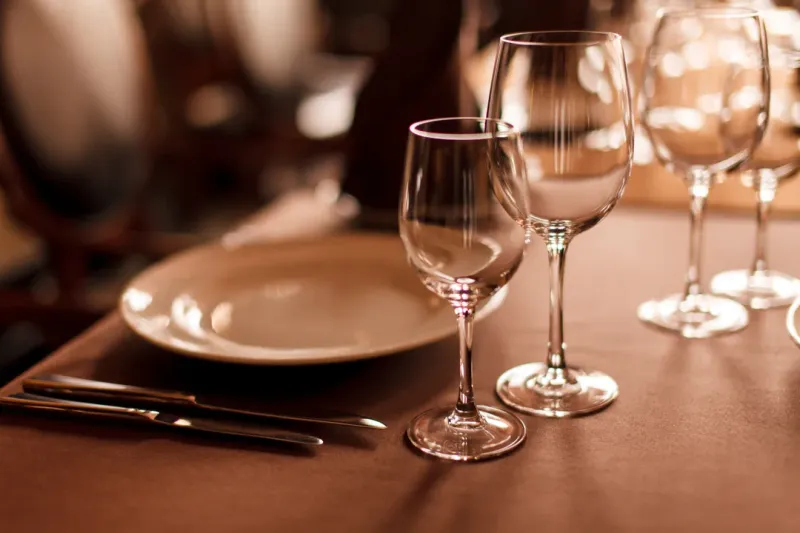 水晶酒杯和餐具图片