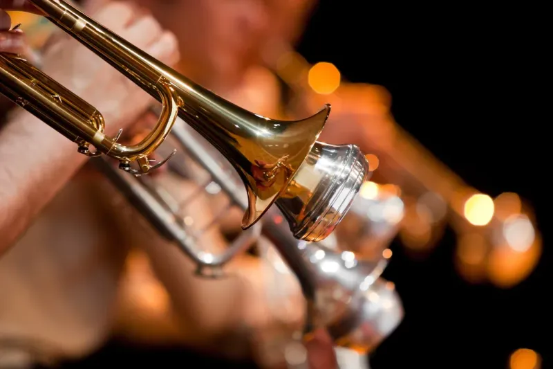 一组音乐爱好者吹乐器小号的图片