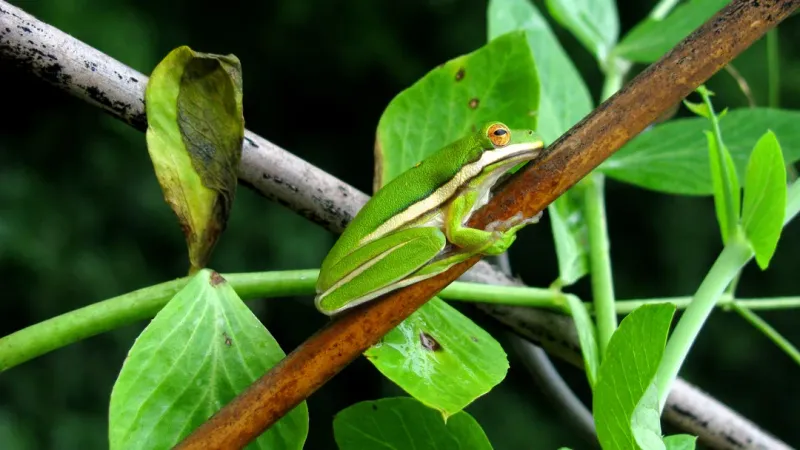 高清青蛙图片大全,分享一组分类动物图片给大家,图中的桌面壁纸会点缀你的电脑桌面,美化自己的心灵! 这张高清青蛙图片显示了一只在树干上的青蛙。这只青蛙的身体色彩是绿色,身体有多个小白点和黑色的纹路。它正在休息状态下,并且在一张枝条上,上面覆盖着苍白色的叶子。这种森林中常见的物种以其适应性和生活环境为特点。