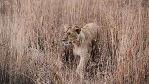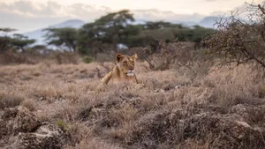 分享一组分类动物图片给大家,包括狮子母狮图片, 图中的桌面壁纸会点缀你的电脑桌面,美化自己的心灵! 这张图是一张非常清晰的画面,显示了一只大型金色狮子站在水边的乳香树下。狮子正准视观者,面部表情坚定且自信。颜色丰富,特别是金色狮子的毛发和黄色的水溅,与周围绿色树林和土地形成了鲜明的对比。这张图给人以一种强大而自然的印象,同时也显示了狮子在野外生活的动态。