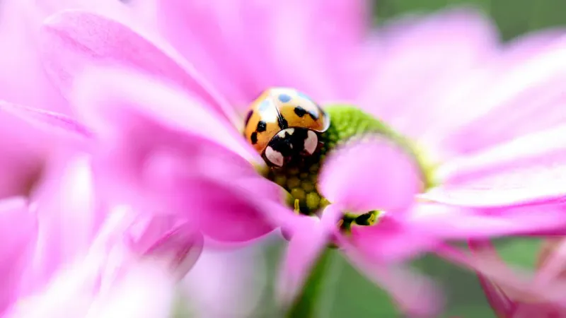 高清瓢虫微距摄影图片,分享一组蝴蝶和瓢虫昆虫的图片给大家,图中的桌面壁纸会点缀你的电脑桌面,美化自己的心灵! 这张图像显示了一只瓢虫,很可能是猜犬科的昆虫,正在深入到了一片粉色花朵中。瓢虫和花朵共同创造出了一个美丽的、自然的景象。瓢虫的身体呈现出红色,而花朵则是粉色,两者形成了对比明显的色彩。这种瓢虫通常在花园或草地中活动,有时也被视为干扰性生物,但在这种情况下,其存在给人们带来了美丽的自然景色。