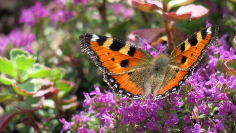 高清蝴蝶图片大全,分享一组蝴蝶昆虫图片给大家,图中的桌面壁纸会点缀你的电脑桌面,美化自己的心灵! 这组图片显示了一个带有黄、黑和红色花纹的蝴蝶在盛开的紫色植物上。蝴蝶几乎完全展开翅膀,显示了其灰色身体和鲜艳的色彩。这些植物周围的花朵很美丽,盛开并覆盖了大部分图片的背景。这些图片传达了生态系统中昆虫与花卉之间的互动和美的相互作用。