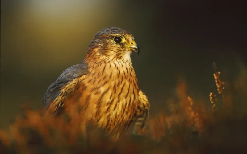 鹰科鸟类壁纸,分享一组鸟类合集图片给大家,图中的桌面壁纸会点缀你的电脑桌面,美化自己的心灵! 这张图片显示了一只野鸟,可能是拇头鹰(Kestrel)或者其他类似的猛禽。它站在一个草地背景上,周围的草和树叶显示出金黄色的调色,这可能是由于某种光线效果。鸟的身体和头部展现了较暗的灰色,而其腿和爪子则呈现一个更明显的黄色。鸟正在仔细观察周围环境,这表明它可能在等待猎物或者保持戒备状态。