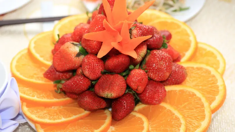 分享一组水果蔬菜图片给大家,图中的桌面壁纸会点缀你的电脑桌面,美化自己的心灵!这张图显示了一个盛宴上的蜜柑和草莓锦樣式。这是一种传统的日本美食,通常在特殊的场合或节日举行。中心部分显示了绚丽的花状饰品,包含红色的草莓和黄色的蜜柑片。这个花状饰品是一种传统的日本设计,用于装点食物并表达祝福或庆祝之情。周围环境中,我们可以看到其他食品和餐桌上的纸巾、餐具等,这表明这是一个完整的宴会设置。