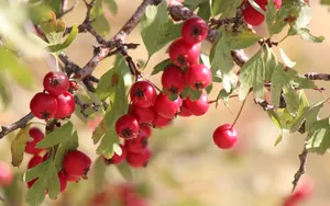 红的诱人的山楂图片显示了一棵苹果树上的果实。该树上有丰富的红色或深紫色的苹果,它们很可能是山楂(Pomegranate)或者某种类型的红色水果。树叶颜色绿色,表面光滑亮丽,与树上的果实相互呼应。这张图片会点缀你的电脑桌面,分享一组美丽的水果和蔬菜图片给大家,美化自己的心灵!这个图片展示了自然中美丽多样的生物和花草种类,其中包括山楂、苹果以及花朵。